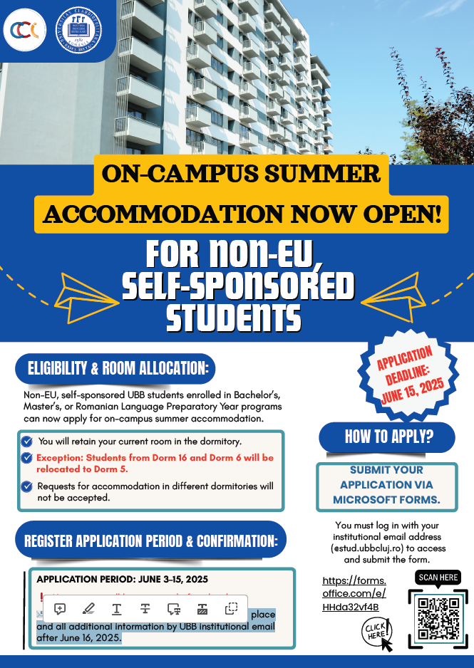 Non-EU, self-sponsored UBB students enrolled in Bachelor’s,Master’s, or Romanian Language Preparatory Year programs can now apply for on-campus summer accommodation.