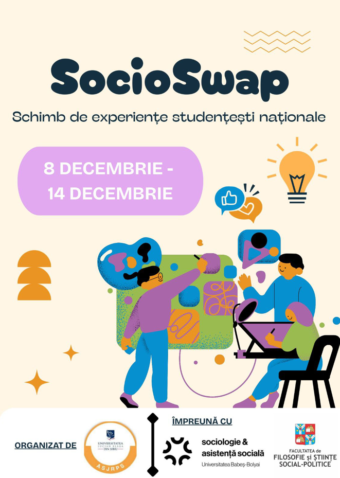 Facultatea de Sociologie și Asistență Socială (UBB) anunță deschiderea înscrierilor pentru SocioSwap – ediția a II-a, un schimb de experiență organizat în parteneriat cu Universitatea „Lucian Blaga” din Sibiu.